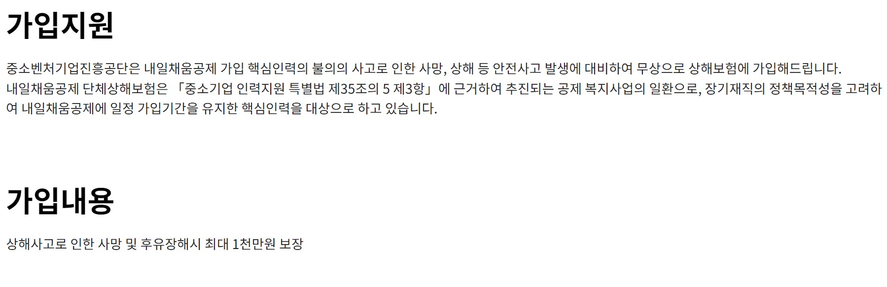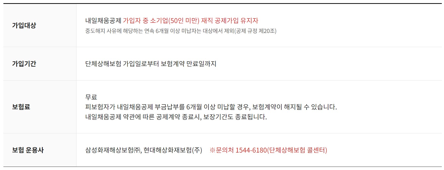 | 보험료 | 무료 피보험자가 내일채움공제 부금납부를 6개월 이상 미납할 경우, 보험계약이 해지될 수 있습니다. 내일채움공제 약관에 따른 공제계약 종료시, 보장기간도 종료됩니다. |